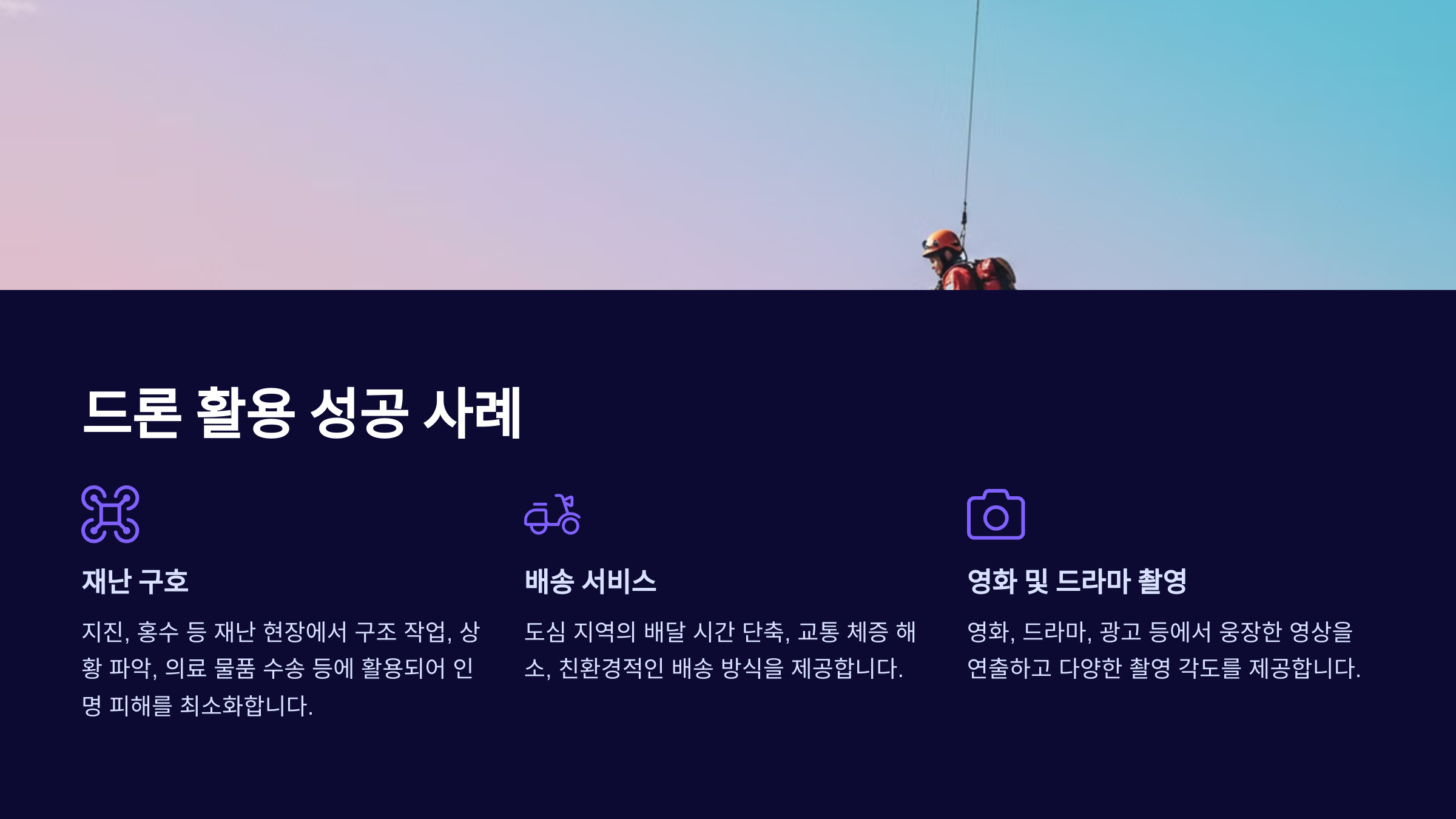 | 재난 구조 | 산불 감시, 홍수 지역 탐색, 실종자 수색 | 열화상 카메라 드론, 구조용 드론 |