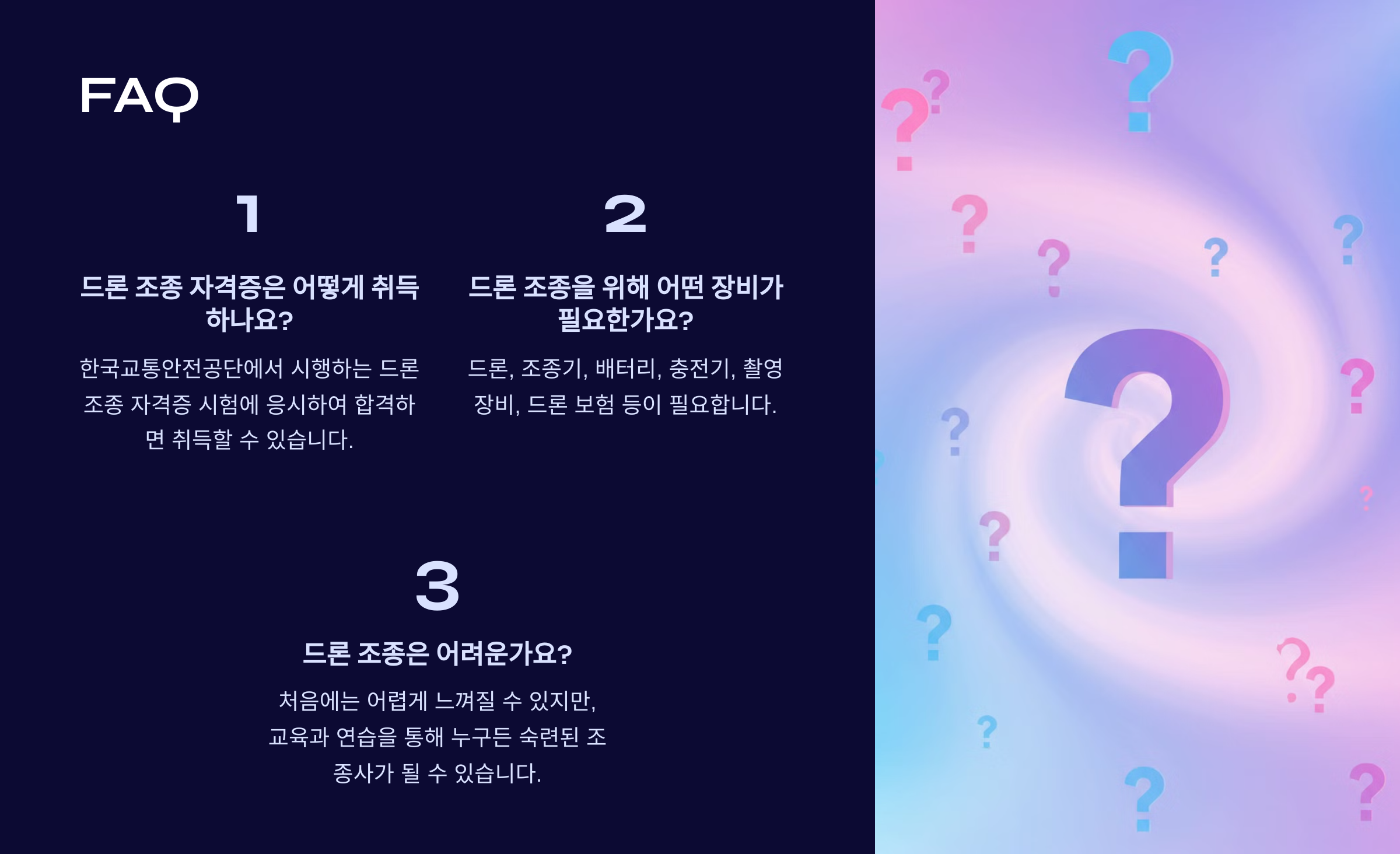드론은 미래의 핵심 기술 중 하나로 자리 잡을 것이며, 이를 활용한 새로운 직업과 산업이 계속해서 생겨날 거예요. 그렇다면, 드론 조종 전문가에 대해 자주 묻는 질문들을 정리해볼까요? 💬