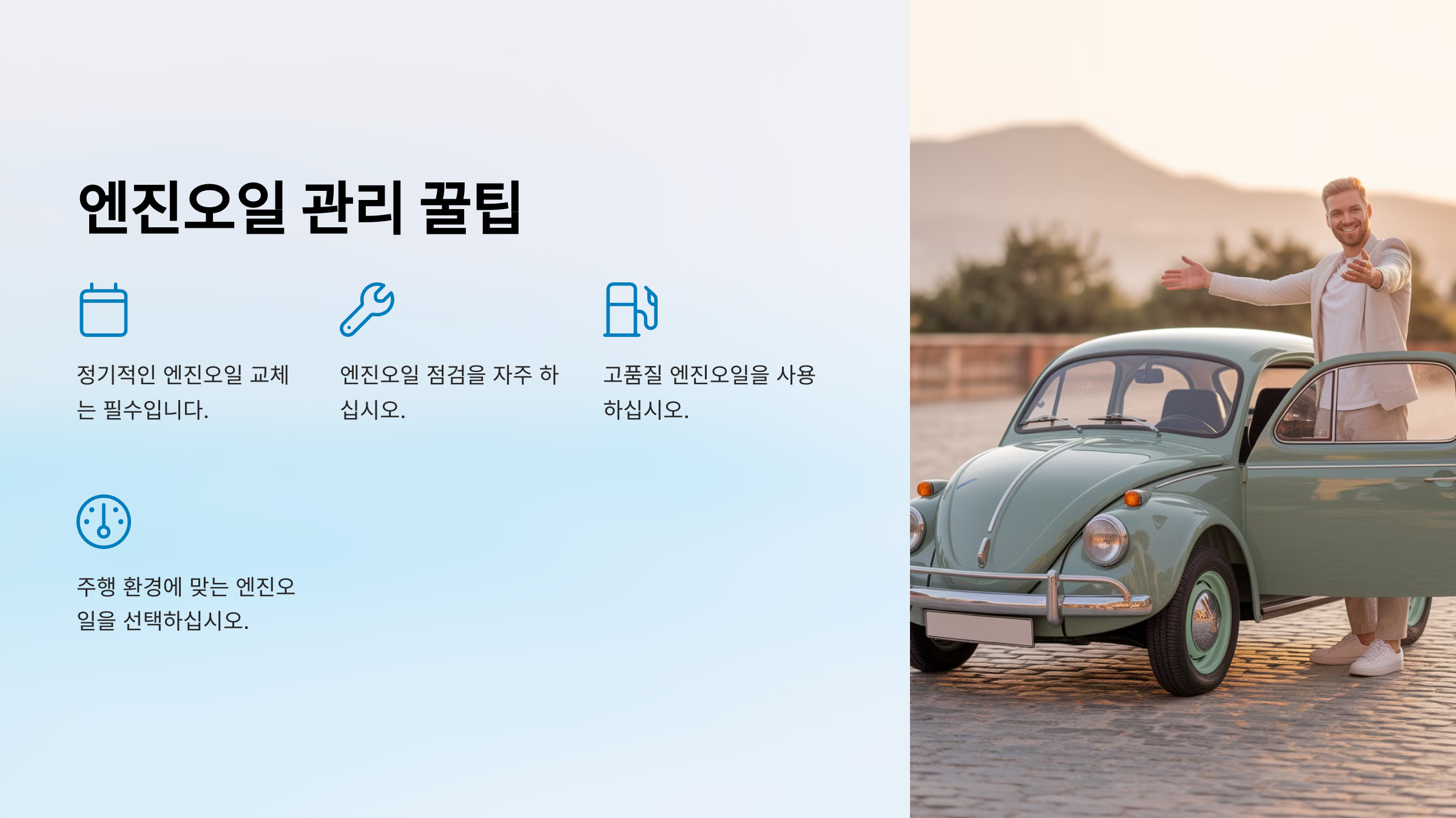 - ⚠️ 엔진 고장 예방: 오염된 오일이 쌓이면 성능 저하 및 수리비 증가.